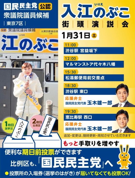 📍11:00 渋谷駅宮益坂下 📍12:00 マルマンストア代々木八幡 📍15:30 松濤郵便局前交差点 🔥18:30 渋谷駅東口(玉木代表合流!) 🔥19:30 恵比寿駅西口(玉木代表合流!)