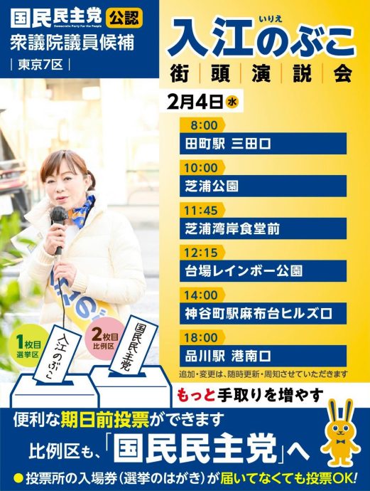 明日の入江のぶこの街頭演説スケジュールです。 明日2/4(水)も全力で駆け抜けます!🏃♀️